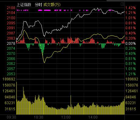 截至午盤,滬指報2105.06點,上漲56.57點,漲幅1.28%,成交1286.78億元;深成指報7503.40點,上漲128.09點,漲幅1.74%,成交1294.91億元;創業板指報1271.88點,下跌21.21點,跌幅1.64%,成交238.21億元。