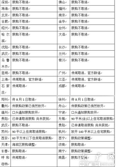 據(jù)央廣網(wǎng)財經(jīng)統(tǒng)計,在46個限購城市中,明確還未取消限購的有22個,對限購政策作出調(diào)整的有8個,傳聞已放開或?qū)⒎砰_限購的有10個,全面放開限購的5個。近半數(shù)城市表現(xiàn)淡定,仍然“按兵不動”,政策堅挺。