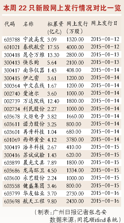 廣州日報訊 數(shù)據(jù)顯示,本周有22只新股申購,其中,航天工程、健盛集團(tuán)、龍馬環(huán)衛(wèi)、華友鈷業(yè)、晨光文具等12只新股擬登陸上交所。蘇試試驗、快樂購、中文在線等7只在創(chuàng)業(yè)板上市。萬愛迪爾、達(dá)院線、利民股份等則將登陸中小板。