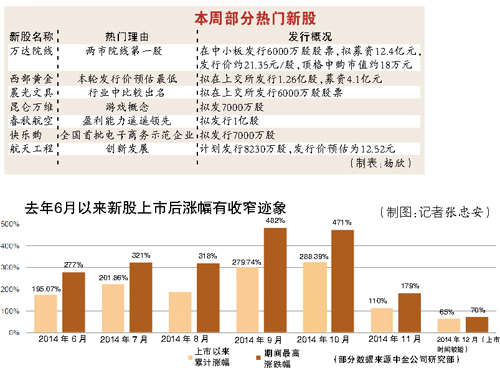 市場對新股上市后的操作也有降溫跡象。上周二,剛剛上市四個交易日的葵花藥業(yè)打開漲停,隨后股價三天下跌了10%。同時,王漢峰也指出,由于2015年新股發(fā)行較為密集,新股的稀缺性將有所下降,預(yù)計本批新股全部凍結(jié)資金為1.9萬億~2.2萬億元。申銀萬國分析師預(yù)測,將會在0.51%~1.6%。