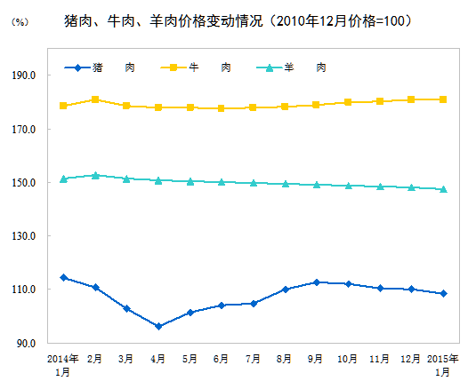 國家統(tǒng)計局數(shù)據(jù)顯示,2014年12月份CPI同比上漲1.5%。據(jù)商務(wù)部監(jiān)測,進入2015年1月份以來,全國36個大中城市食用農(nóng)產(chǎn)品市場價格總體略有上漲,其中,18種蔬菜平均價格小幅上漲,但豬肉等肉類價格一路走低。