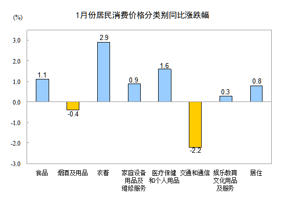 1月份,非食品價格同比上漲0.6%。其中,衣著、醫(yī)療保健和個人用品、家庭設(shè)備用品及維修服務(wù)、居住、娛樂教育文化用品及服務(wù)價格分別上漲2.9%、1.6%、0.9%、0.8%和0.3%;交通和通信、煙酒及用品價格分別下降2.2%和0.4%。
