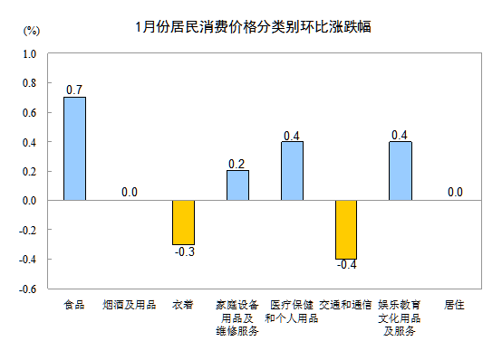 1月份,全國居民消費價格總水平環(huán)比上漲0.3%。其中,城市上漲0.3%,農(nóng)村上漲0.2%;食品價格上漲0.7%,非食品價格持平(漲跌幅度為0,下同);消費品價格上漲0.2%,服務(wù)價格上漲0.3%。