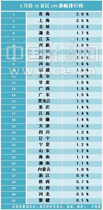 2015年3月31省區CPI漲幅排行榜。制作人:宋雅靜