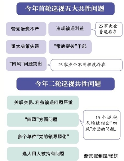 2013年和2014年的四輪巡視,巡視重點都是圍繞“四個著力”發現問題。今年首輪巡視,巡視重點不僅包括“四個著力”,還包括落實“兩個責任”、政治紀律和政治規矩執行情況;今年二輪巡視,巡視重點則調整為“重點發現違反政治紀律和政治規矩、組織紀律的行為,緊緊盯住違反中央八項規定精神的問題”。