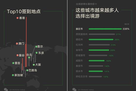 但隨著收入的提升和消費(fèi)升級(jí),出境游已成為越來(lái)越多二三線城市居民的度假選擇,微信的統(tǒng)計(jì)數(shù)據(jù)顯示,廣西、云南、陜西等省份的居民選擇出境旅游的人數(shù)也在快速上升,其中,廣西省崇左市微信用戶的出境人數(shù)增長(zhǎng)率達(dá)338%。