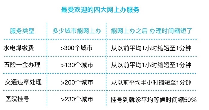 現(xiàn)在能全國超過300個(gè)城市,有100多類服務(wù)實(shí)現(xiàn)了網(wǎng)上辦理,老百姓常用的熱門服務(wù)中,超過一半開始能夠網(wǎng)上辦理。其中水電煤繳費(fèi)、五險(xiǎn)一金的查詢與提取、交通違章信息查詢和處理、醫(yī)院遠(yuǎn)程掛號(hào)是老百姓使用最多,最歡迎的四大服務(wù)。