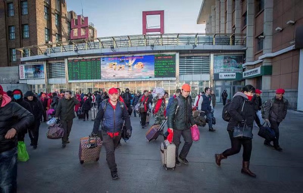 返鄉務工人員離開火車站前往站內客車乘車點(中鐵哈爾濱局供圖)