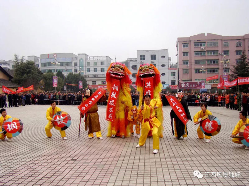 客家燈彩——活靈活現。銅鼓客家獅、太平燈、漁樵耕讀、七鯉搶蝦等燈彩都是群眾喜聞樂見的歡慶活動,均入選了省級非物質文化遺產保護名錄。其中,銅鼓客家獅將獅由“怪獸”化為“神獸”,并通過舞蹈、武術、雜技、戲劇等多樣性表演來表達新春祝福。銅鼓客家獅一般從每年農歷初一始在祠堂內請神、拜獅、起蘸,正月十五勾燈結束。其間,每到一村先尋一開闊地表演孫悟空、豬八戒、沙和尚降獅(三僧伴舞風趣幽默,獅有熊獅、眼獅、悶獅等動作);另有疊花架,十八般武藝對練,雜技表演等,全套表演人數十四人,時間約二小時左右。表演結束后由悟空引獅至各家送福送喜。