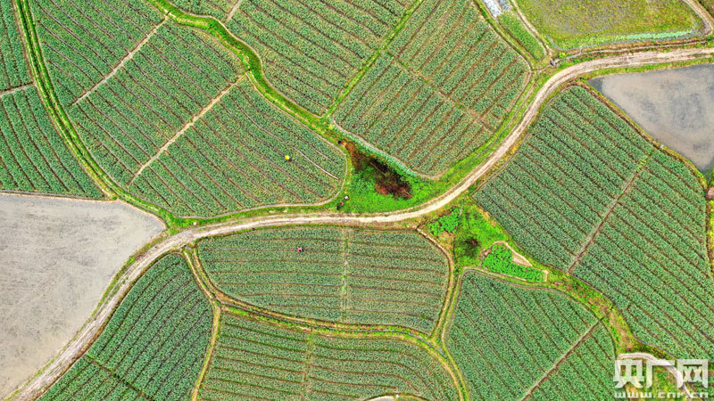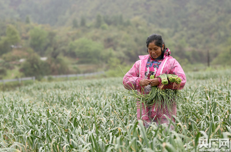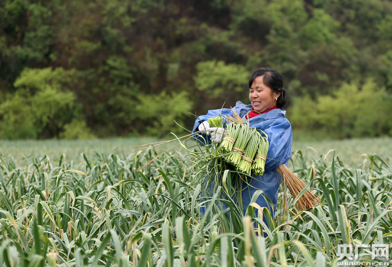 村民們正在蒜田中收獲蒜苔
