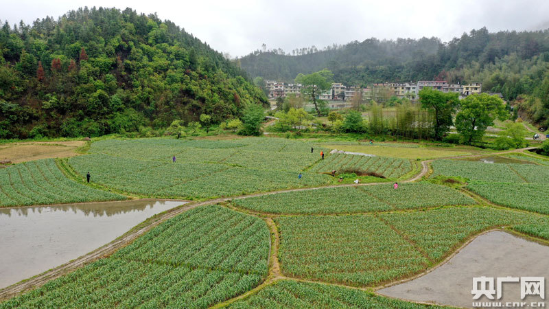 3月31日,江西省吉安市吉水縣螺田鎮大坵灣村,蒙蒙細雨中,一片豐收的歡聲笑語,村民們正在蒜田中收獲蒜苔。