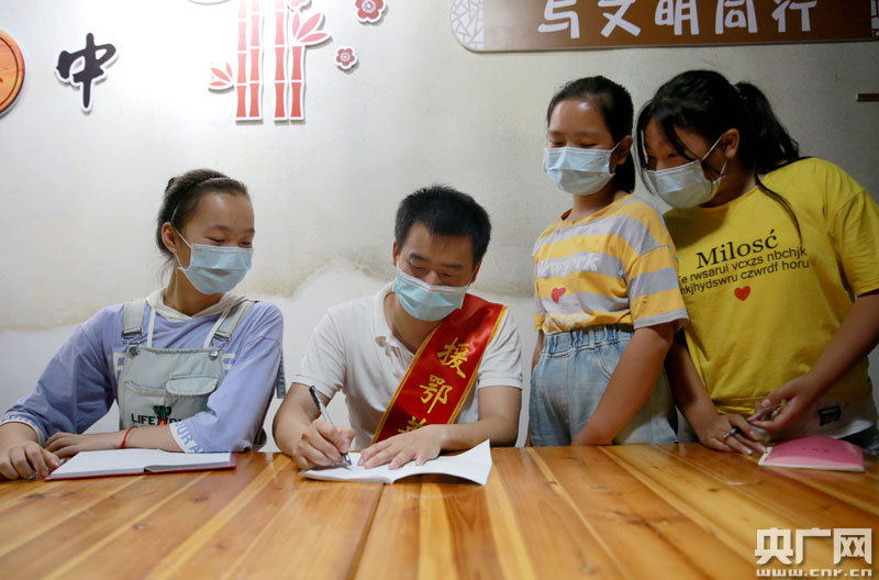 孩子們請援鄂抗疫英雄胡萬峰為自己簽名留言(央廣網發 通訊員廖敏 攝)