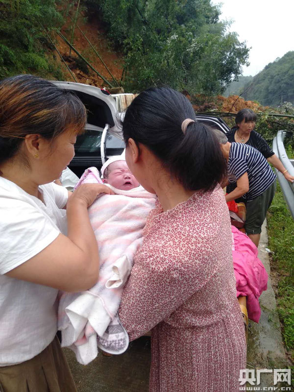 接到報警后,該鎮派出所民警、消防員和鎮村干部立即趕往現場展開救援。因通往現場多處道路被洪水和滑坡山體淹沒,救護車無法抵達現場,該鎮立即請來一名鄉醫幫忙生產,凌晨6時13分,孕婦順利在自家車內產下一子。