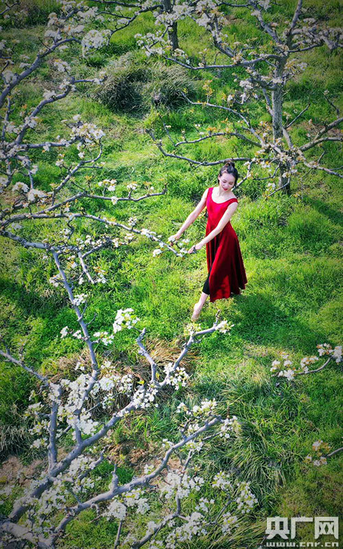 舞蹈愛好者在梨花林里,翩翩起舞(央廣網發 通訊員田俊/攝)