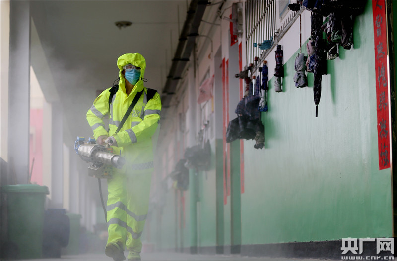 2020年3月26日,江西省吉安市吉水縣吉水中學,吉水藍天救援隊隊員正在義務為校園進行全面消殺。