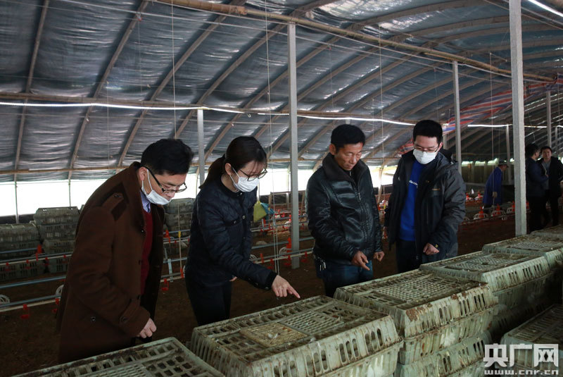 劉旸瑒和工作隊隊員一起查看新的養(yǎng)雞大棚安裝情況