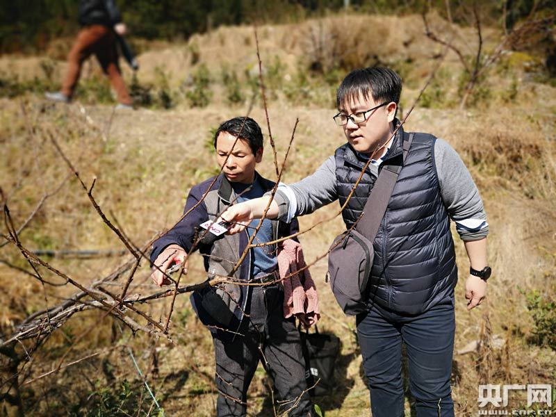 駱德濱向記者介紹自家的黃桃林(央廣網發 謝元森攝)