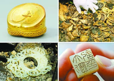 ▲拼版照片,左上圖為:海昏侯墓出土的馬蹄金(2015年11月24日攝);右上圖為:海昏侯墓主棺出土的金餅、馬蹄金、麟趾金和金板(2015年12月24日攝);左下圖為:海昏侯墓出土的龍虎形玉佩(2015年11月18日攝);右下圖為:;韬钅钩鐾恋目逃小按髣⒂浻 弊謽拥凝斝斡裼。2015年12月13日攝)。