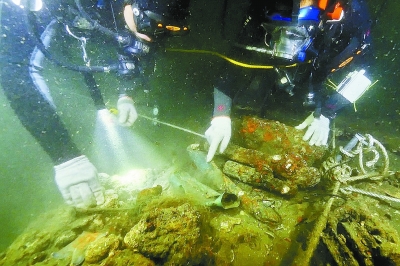 “丹東一號”考古人員在水下工作(2015年10月5日攝)。