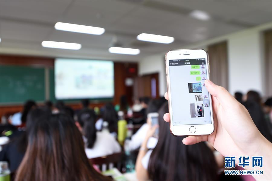 5月24日,一位同學在展示其通過微信“彈幕”發給老師和投影儀的內容。重慶大學新聞學院大二選修課《網絡與新媒體》放棄傳統課前點名方式,通過微信對學生進行定位簽到。課程通過微信記錄下的定位簽到記錄和課堂測驗記錄都將在期末折算成平時成績。該選修課授課老師還通過微信進行課堂教學,允許學生在課堂上隨時通過微信“彈幕”提問并與老師互動。新華社記者 唐奕 攝 圖片來源:新華網