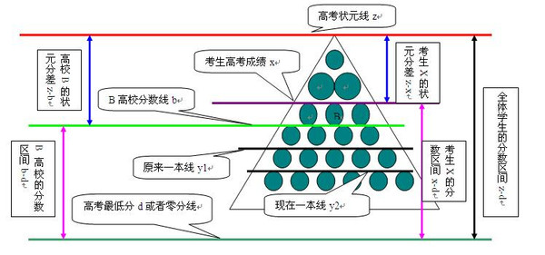二本、三本合并,一本擴容后,如何根據分數定位學校是擺在高三學生及家長面前極為迫切而嚴峻的問題,因為相當多原來的二本院校擠入一本來招生,一本分數線相比于以前變化比較大,各學校的錄取分及平均分相對于一本線將出現變化,如果再用原來的分差進行定位時,就會出現誤差。再者,二本、三本合并后,原來的二本線、三本線相比于現在的二本線都會有一定的變化,因此用原來的三本分差或者二本分差都會出現問題。具體變化情況如圖所示: