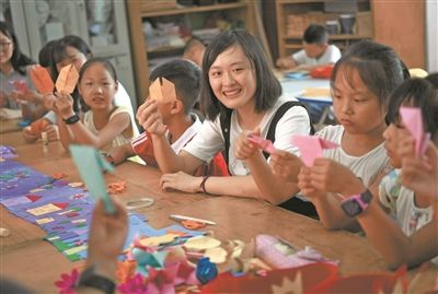7月25日,大學生志愿者給江西省南昌市灣里區太平鎮獅峰學校的留守兒童們上手工課。 暑假期間,南昌大學的大學生志愿者來到地處山區的太平鎮開展“彩虹工程”暑期夏令營活動,為50多名留守兒童開設了美術、音樂、國學和心理輔導等課程,給山里娃帶來了一個快樂的“彩虹假期”。