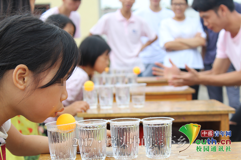 志愿者和孩子們開心的玩著吹兵乓球的游戲,志愿者在一旁幫孩子們加油鼓勁。 中國青年網通訊員 韋康成 攝