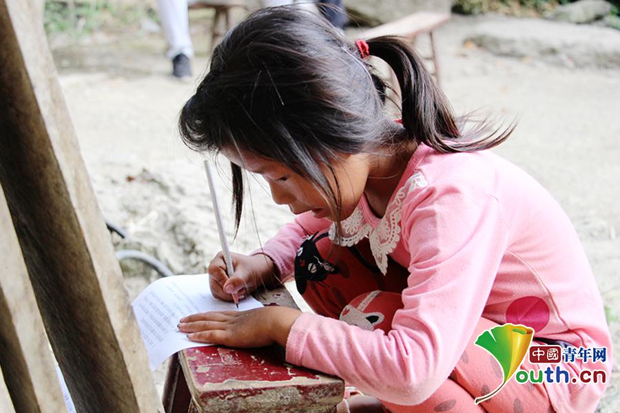 妹妹張婷在小板凳上寫作業。中國青年網通訊員 譚雅玲攝 走了一個小時的山路,志愿者們都有些疲憊,但是亮亮和婷婷依然活蹦亂跳,亮亮的家住在離學校8公里遠的地方,兄妹倆需要每天早上5點鐘從家里出發,才能保證上課不會遲到。 亮亮和婷婷從小就是老兩口拉扯大的,爺爺現在已是古稀之年,奶奶腿腳也不方便。“孩子媽媽在他們很小的時候就改嫁了,從那以后,亮崽只見過媽媽一次,婷婷打生下來就沒見過媽媽。”爺爺說,孩子爸爸在廣州打工,每年只有在過年時才回家待幾天,“家里就剩我們老兩口和倆孩子,我現在只希望兩個孩子能有書讀。” 窮人的孩子早當家,亮亮和婷婷從小就懂事,每天放學后寫完作業,就提著碩大的水桶去打水,再踮著腳在高高的鍋臺邊炒菜……“亮崽和婷婷在各方面都很下勁兒,從來不會向我們要東要西,就是家里條件不好,苦了倆孩子。”說到這里,爺爺有意將頭扭到一邊,然后默默地轉身離開,背影孤獨又無助。 從亮亮兄妹倆的身上,趙晨領悟到了什么是堅毅,什么是逐夢,他們雖然留守在農村,但是卻留不住他們奮發讀書的夢想,想要走出大山的希望。 攜手 關愛保護快樂成長 近日,《2017中國留守兒童心靈狀況白皮書》發布,調查顯示,一半以上的農村完全留守兒童與父母一年見面次數少于2次;近三分之一的農村缺父留守兒童與父親一年見面次數少于2次。 關于這點,張亮兄妹就是活生生的例子,通常情況下,他們一年才能和父親見一次面,而據貴州師范大學求是學院志愿者介紹,神溪小學的很多孩子們都和張亮兄妹的情況十分相似:父母常年在外打拼,只有春節期間才能與孩子有短暫的相聚。 留守兒童性格柔弱內向、自卑、孤獨、怨恨父母、學習狀況一般等現實問題牽動著每個人的心,其緩解和解決迫在眉睫,也已引起相關部門的高度關注。 2016年底,民政部發布的《關于在全國開展農村留守兒童“合力監護、相伴成長”關愛保護專項行動的通知》中明確指出,地方各級民政部門要將摸底排查中發現的無人監護、父母一方外出另一方無監護能力的農村留守兒童花名冊通報給同級公安機關,縣級民政部門同時將花名冊通報給當地鄉鎮人民政府(街道辦事處)。公安機關應當及時會同村(居)民委員會聯系外出務工的留守兒童父母,責令其立即返回或確定受委托監護人,并對其進行教育、訓誡,要求其依法履行監護職責。這無疑為留守兒童更加健康快樂地成長帶來了福音。 關愛留守兒童離不開全社會的共同努力,共青團中央、中央文明辦、教育部、民政部聯合部署青年志愿者關愛農村留守兒童“七彩假期”志愿服務工作,中央宣傳部、中央文明辦、教育部、共青團中央、全國學聯組織開展全國大中專學生志愿者暑期文化科技衛生“三下鄉”社會實踐活動……無數“譚雅玲們”正在這些活動的鼓勵和指導下,走進貧困地區、革命老區、邊疆地區,為留守兒童和貧困家庭兒童開展課業輔導、素質拓展、親情陪伴等教育精準扶貧關愛活動,為他們帶去關懷與溫暖,幫助他們長知識、開眼界,為“十三五”脫貧攻堅,全面建成小康社會貢獻力量。