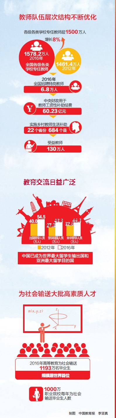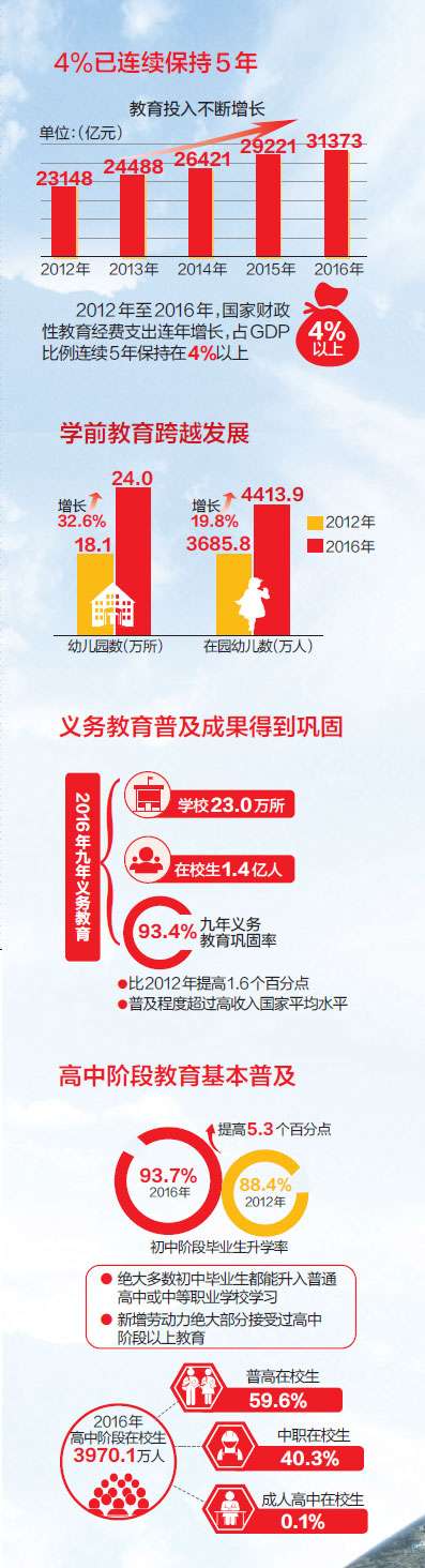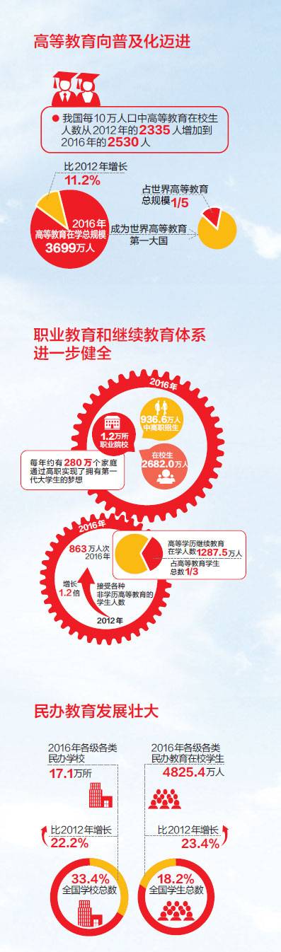 人民群眾享有更多教育獲得感——學生資助體系全覆蓋,特殊教育發展水平顯著提升,義務教育階段進城務工人員隨遷子女八成就讀公辦校,營養改善計劃成效明顯,留守兒童關愛服務體系建立,全面改善貧困地區薄弱校,實施中西部高等教育振興計劃,讓更多農村孩子上重點大學;