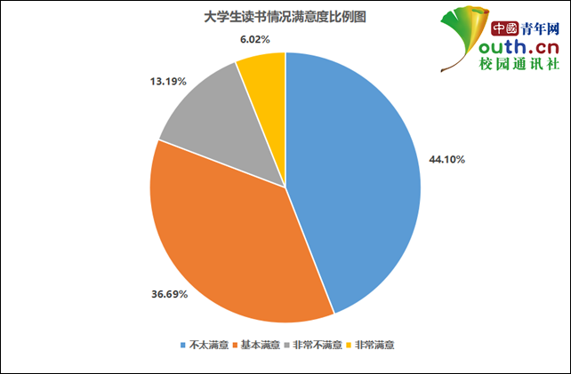 調(diào)查顯示,有44.1%的受訪學生對自己讀書情況不太滿意,36.69%的受訪學生基本滿意,認為非常不滿意和非常滿意的分別為13.19%和6.02%。