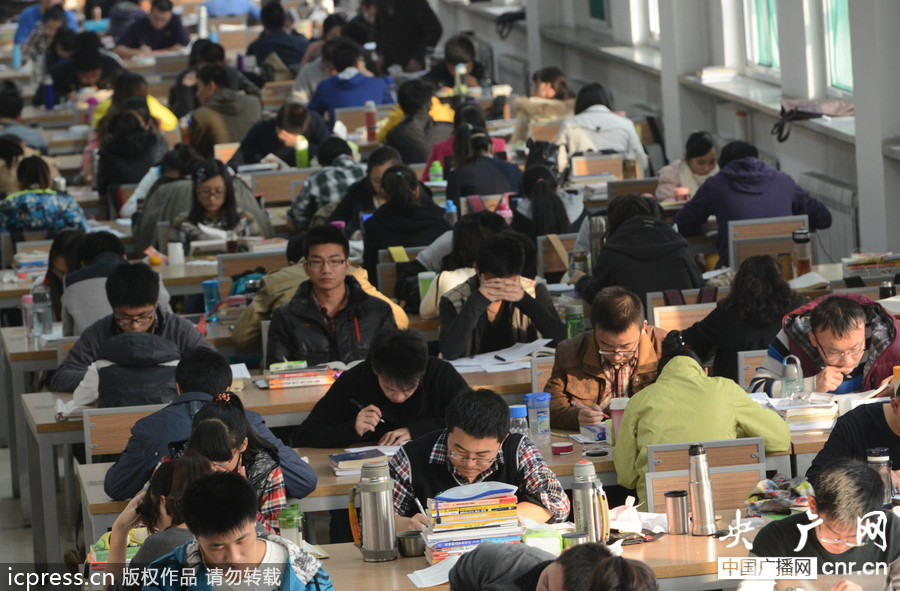 2013年10月29日,山西太原,目前2014年考研報(bào)名即將收官,備戰(zhàn)考研的大學(xué)生們進(jìn)入了最后的沖刺階段。記者利用近一周的時(shí)間,進(jìn)入山西大學(xué)、太原理工大學(xué)、山西醫(yī)科大學(xué)等高校,晝夜跟拍備戰(zhàn)考研的“學(xué)霸”們,用鏡頭記錄下他們考研路上的苦樂日子。自習(xí)室、圖書館、走廊、宿舍……在大學(xué)校園里,隨處都能看到考研的學(xué)生在埋頭苦讀的身影,他們懷揣著研究生夢想,準(zhǔn)備抓住考前兩個(gè)月的時(shí)間“血拼”一把。
