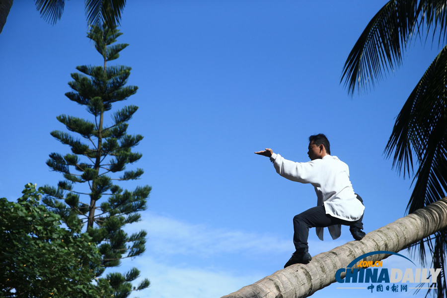 近日,在海南大學校園內一名站在椰子樹上練功的“神人”在網上走紅。2013年10月30日,記者現場目睹這位“神人”的了得功。其進行簡短熱身后,快速“飛奔”上椰子樹,進行單腳獨立或展臂雙飛動作練武功,足有20多分鐘,其神情泰然自若,吸引了不少圍觀者。