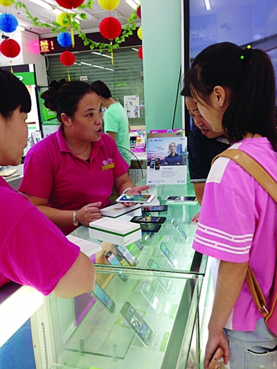 家長(zhǎng)們帶著孩子在選購(gòu)手機(jī)。季娜娜 攝