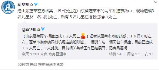 據(jù)新華視點(diǎn)微博消息,經(jīng)山東蓬萊警方核實(shí),19日發(fā)生在山東省蓬萊市的兩車相撞事故中,現(xiàn)場(chǎng)造成3名兒童及一名司機(jī)死亡,后有8名兒童在搶救過(guò)程中死亡。