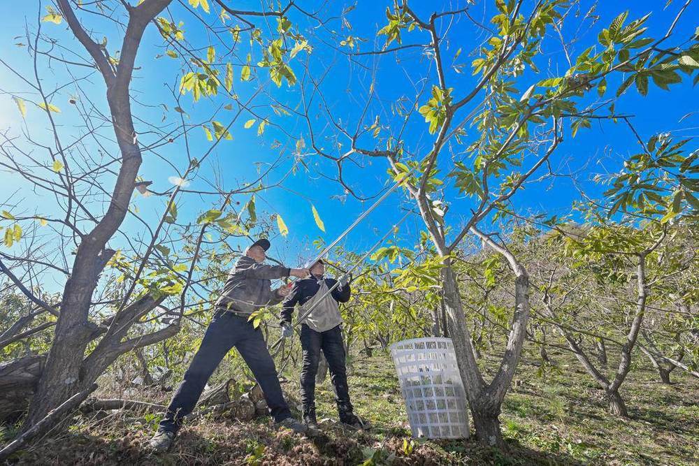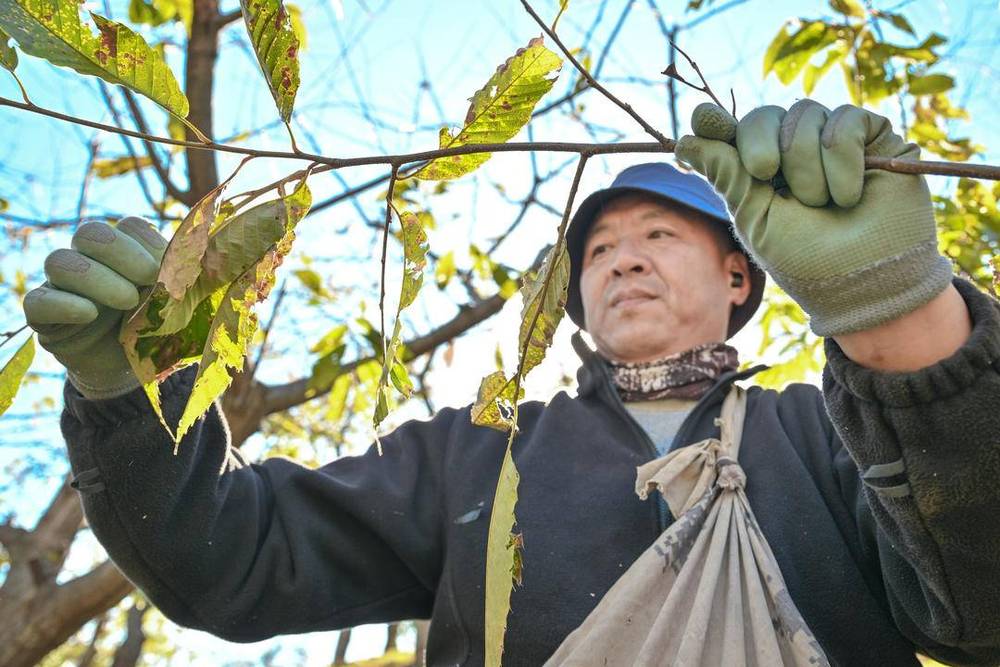 柞蠶不長在柞樹上,怎么跑到板栗樹上了?“我是從去年開始嘗試板栗樹放蠶的,發現效果不錯,今年只放了900個蛾,能收2000多斤蠶繭,加上1萬多斤的板栗,一樹兩收。”作為蠶農兼栗農,汪德會心里清楚,養蠶收益可比板栗高得多。為了方便摘繭,他特制了能伸縮的工具,長長的桿子,頭上一個鐵彎鉤,舉起長桿,對準樹上掛著的繭這么一勾,裹著樹葉的蠶繭就穩穩地摘了下來!耙惶炷苷100多斤繭,等過幾天樹葉落光了,樹上只剩下蠶繭,就看得更清楚了。” 望著剛泛黃的樹葉,汪德會細數今年收成:柞樹收了1300多斤繭,加上栗樹的,能有17萬塊吧。