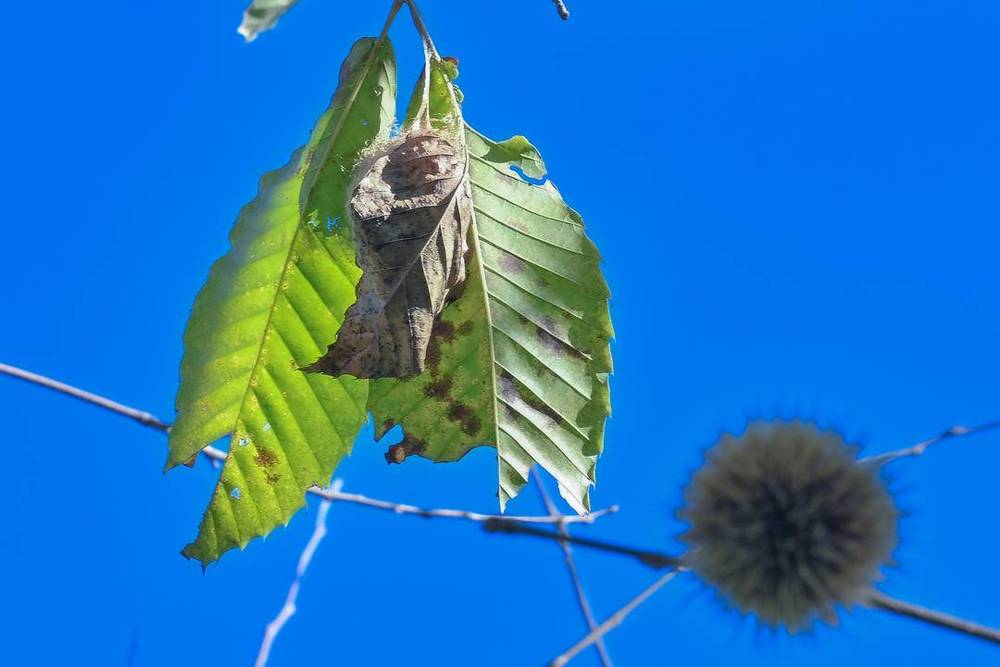 山,離家不遠。山上有汪德會經營的40畝柞樹和80畝板栗樹!10月初收板栗,接著摘柞樹繭,前幾天開始摘板栗樹上的蠶繭,得忙到下個月初! 進山的路,鋪滿落葉,踩在上面,沙沙作響。提起蠶繭價格,汪德會格外高興:“今年可貴了,收購價每斤35元,板栗樹上結的繭個大、質量好,一斤還能多賣三五塊錢!