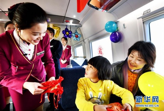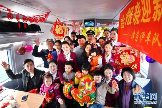 北京鐵路局天津客運(yùn)段津京滬車隊(duì)大學(xué)生乘務(wù)組在北京開(kāi)往紹興的G19 次列車上,開(kāi)展了“金雞報(bào)曉迎新年高鐵送福伴回家”主題活動(dòng),乘務(wù)組通過(guò)自編自演文藝節(jié)目、普及春運(yùn)旅行常識(shí)和為旅客送福字等方式,為旅客們營(yíng)造“平安春運(yùn)、有序春運(yùn)、溫馨春運(yùn)”的和諧氛圍。