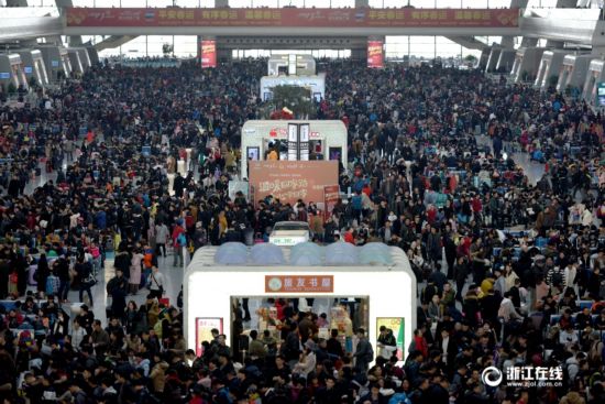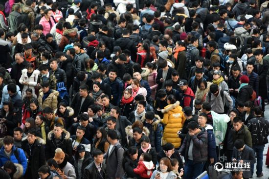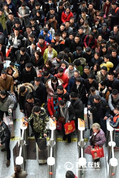 1月22日,杭州火車東站候車大廳人潮涌動,旅客們歸心似箭,行色匆匆。2017年春節日益臨近,鐵路春運在節前最后一個周末迎來客流高峰。從杭州前往云貴、川渝、兩湖等中長途返鄉探親客流已全線啟動。(浙江在線記者 董旭明 攝)