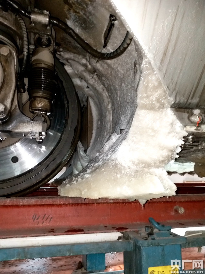 北京鐵路局動車段配屬動車組車底結(jié)冰情況。(央廣網(wǎng)發(fā) 李博攝) -