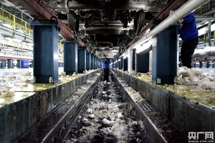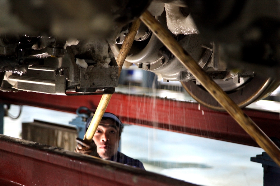 北京鐵路局動車段職工正在進(jìn)行除冰作業(yè)。(央廣網(wǎng)發(fā) 李博攝)