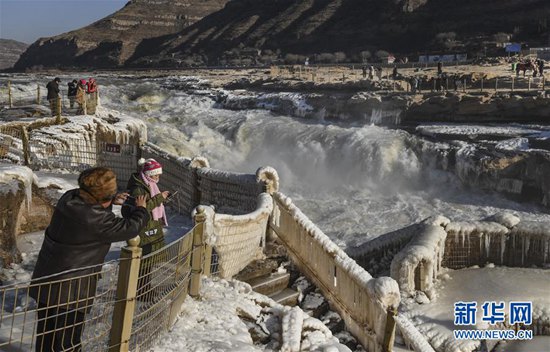 12月11日,吉縣黃河壺口瀑布出現“冰瀑玉壺”景觀。近日,受持續降溫天氣影響,吉縣黃河壺口瀑布出現“冰瀑玉壺”景觀,瀑布下游的十里龍槽已完全被流凌覆蓋,凝結成潔白的“玉帶”,吸引了眾多游客和攝影愛好者前來感受冬日里的別樣景觀。
