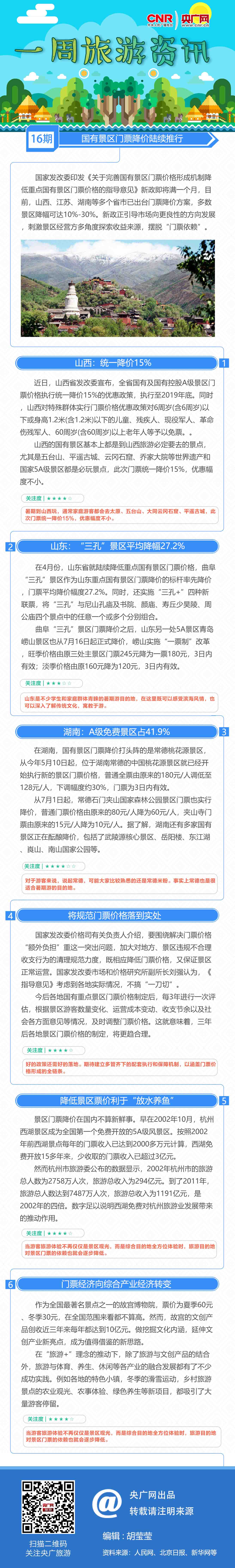 國家發(fā)改委印發(fā)《關于完善國有景區(qū)門票價格形成機制降低重點國有景區(qū)門票價格的指導意見》新政即將滿一個月,目前,山西、江蘇、湖南等多個省市已出臺門票降價方案,多數(shù)景區(qū)降幅可達10%-30%。