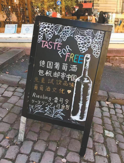 德國法蘭克福,當地葡萄酒商推出了中文廣告牌。