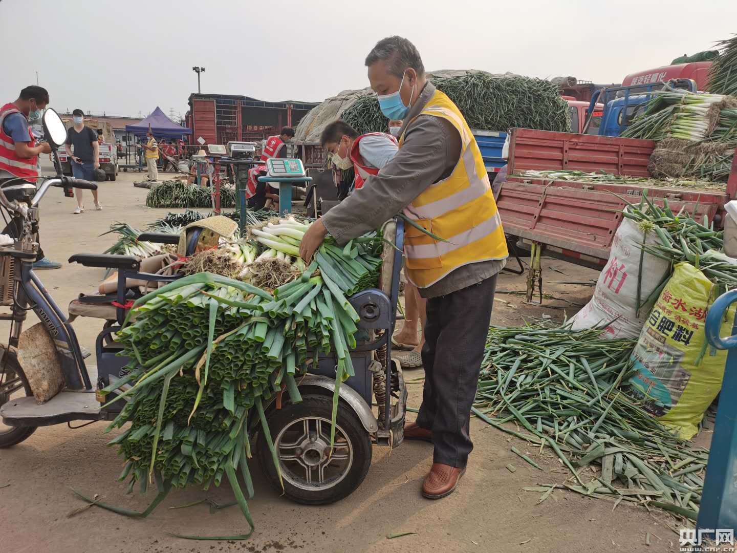 (蔬菜交易區,大蔥商戶正在整理貨物。實習記者王紅霞 攝。)