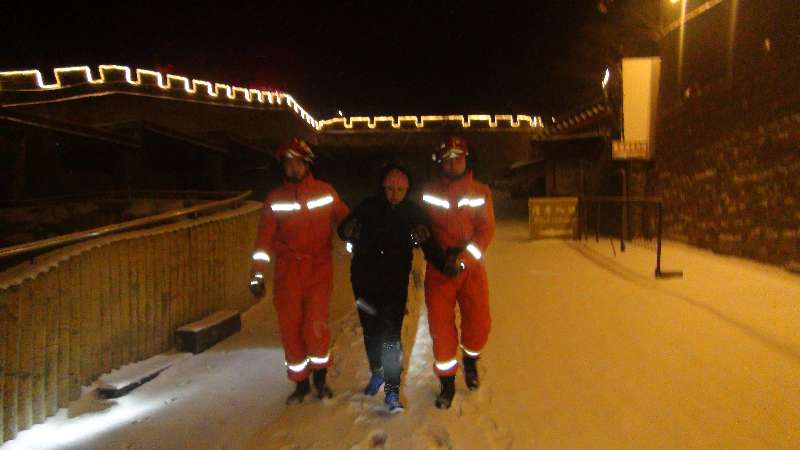 據延慶消防支隊官兵介紹,因今日下大雪,長城上到處都是積雪和薄冰,且在登城途中多處是狹窄路段,一側是懸崖峭壁,一側是叢林深淵,稍不小心就可能滑到兩邊的壕溝里,同時因在山區(qū),手機信號出現時斷時續(xù),更是加大了救援的難度。搜救過程異常艱難和危險,消防官兵經過約1個小時的艱難攀爬,終于尋找到了被困人員。