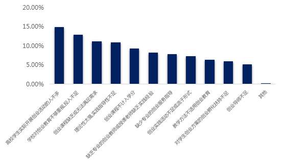 “高校對于創新創業教育的投入不足和缺乏創新創業課程是當前阻礙高校創新創業教育發展的主要問題!崩顟c指出,在阻礙高校創新創業教育發展的主要問題中,高校學生實際開展創新創業活動的人不多占比最大,為14.92%,其次為學校對創新創業教育不夠重視和投入不足,占比12.86%,創新創業課程缺乏或無法滿足需求以11.17%的比例排在第三。