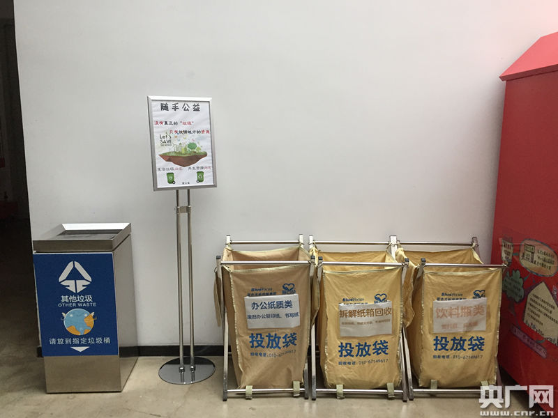 記者在藍色光標(biāo)參觀時發(fā)現(xiàn),在大樓進出口、電梯口、辦公區(qū)和人群聚集區(qū)域內(nèi),均設(shè)置了不同門類的垃圾投放袋,主要包括白色辦公廢紙類、報紙類、雜志書本類、箱板類、飲料瓶類等。員工也都自覺把垃圾按門類分裝包好才扔進不同的垃圾箱內(nèi)。
