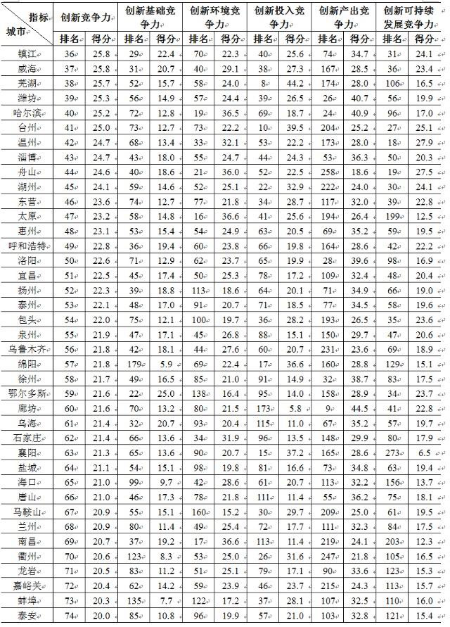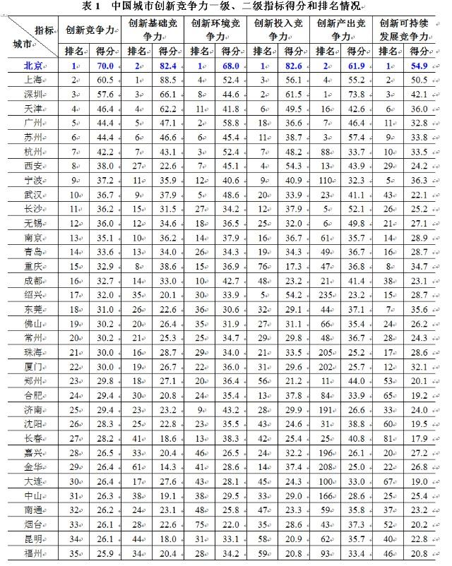中國城市創新競爭力一級、二級指標得分和排名情況。(藍皮書截圖)