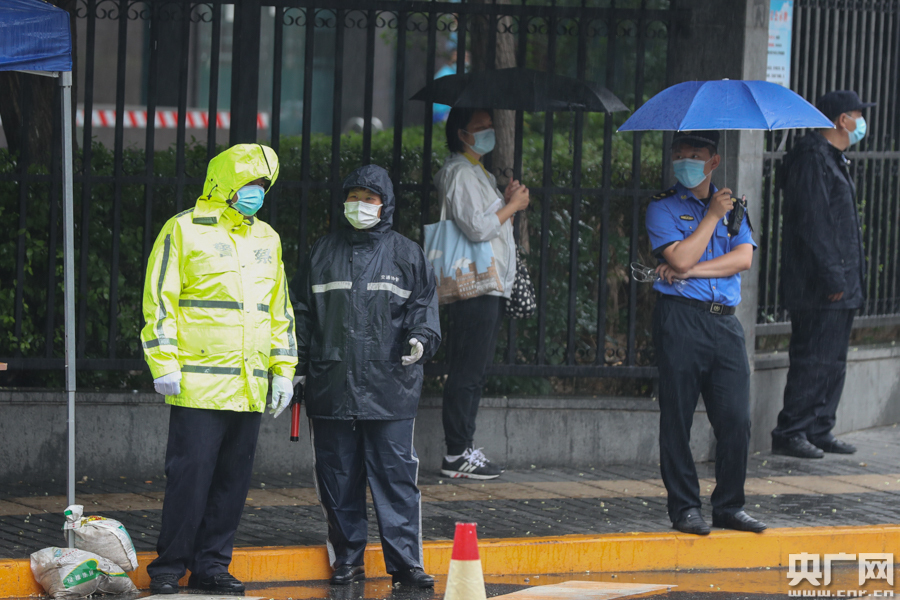 7月9日,北京廣渠門中學考點,工作人員冒雨維持考場周邊秩序(央廣網記者 韓靖 攝)