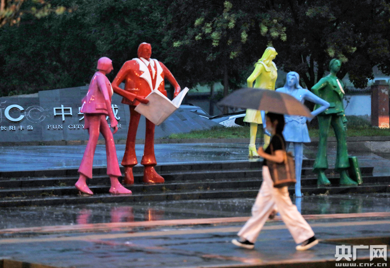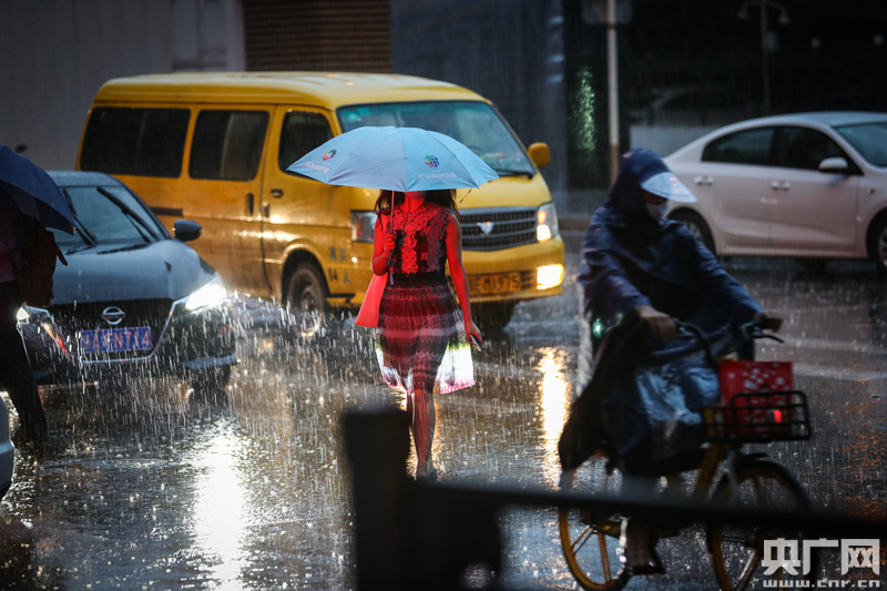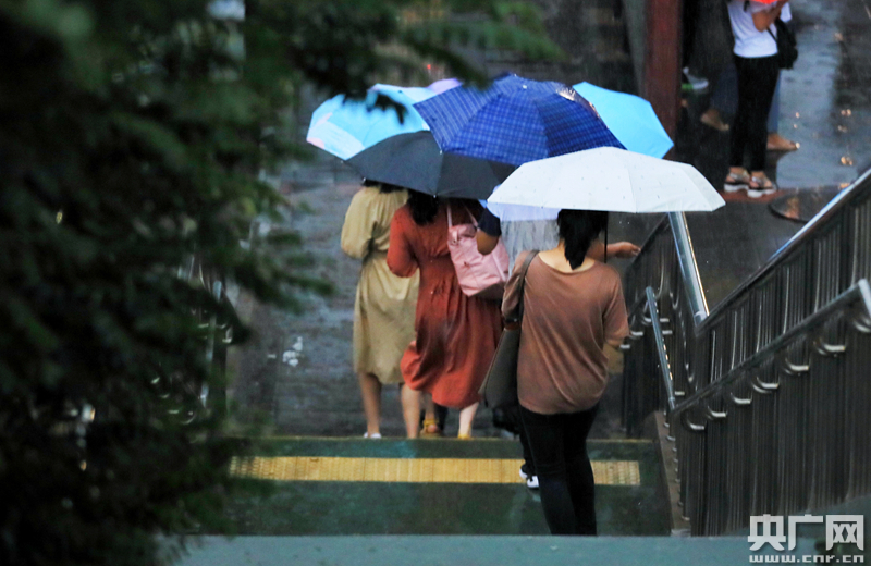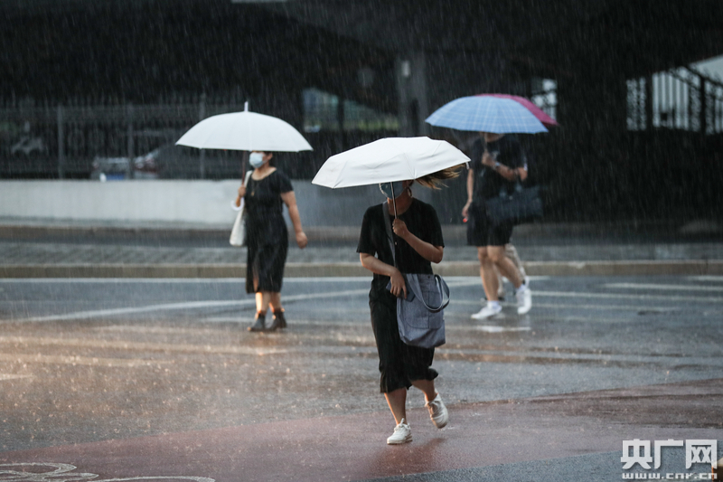 8月12日,北京國貿,雨中的行人(央廣網記者 韓靖 攝)